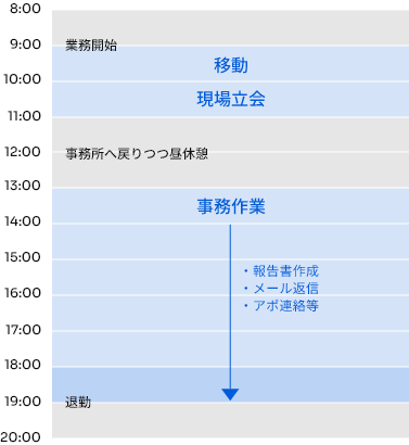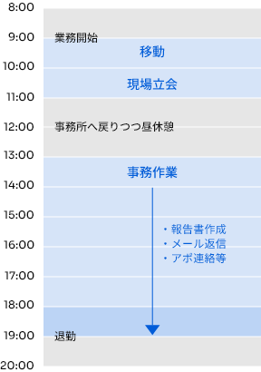 入社してから7月末頃までは単独での業務はなく、先輩方に同行させていただきました。先輩の現場を見て、どういうところに気をつければいいのかを学びましたね。また現場に行く前にはブリーフィング※1を行い、事後にはデブリーフィング※2を行い、保険会社と打ち合わせるべき内容について教えていただいたりしました。8月からは単独で現場に行くようになり、現在は週3〜4回のペースで現場に行っています。